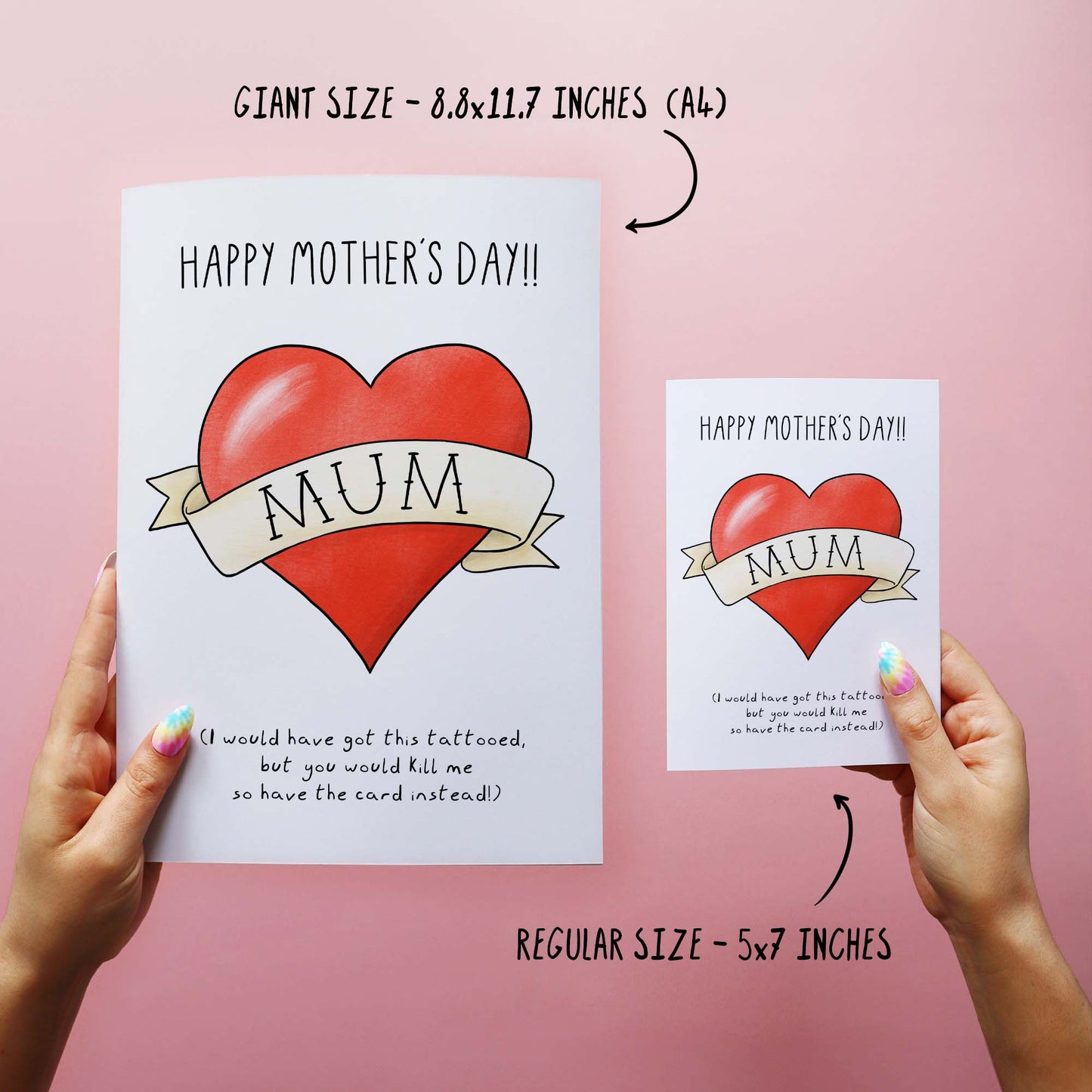 Funny mother's day card for mum. Mother's Day gift for Mom. Card with Mum tattoo illustration reading 'Happy Mother's Day!! (I would have got this tattooed but you would have killed me, so have the card instead!)' After scaring her a little bit you can fill this card with happy Mother's Day messages and pair with funny Mother's Day gifts too!